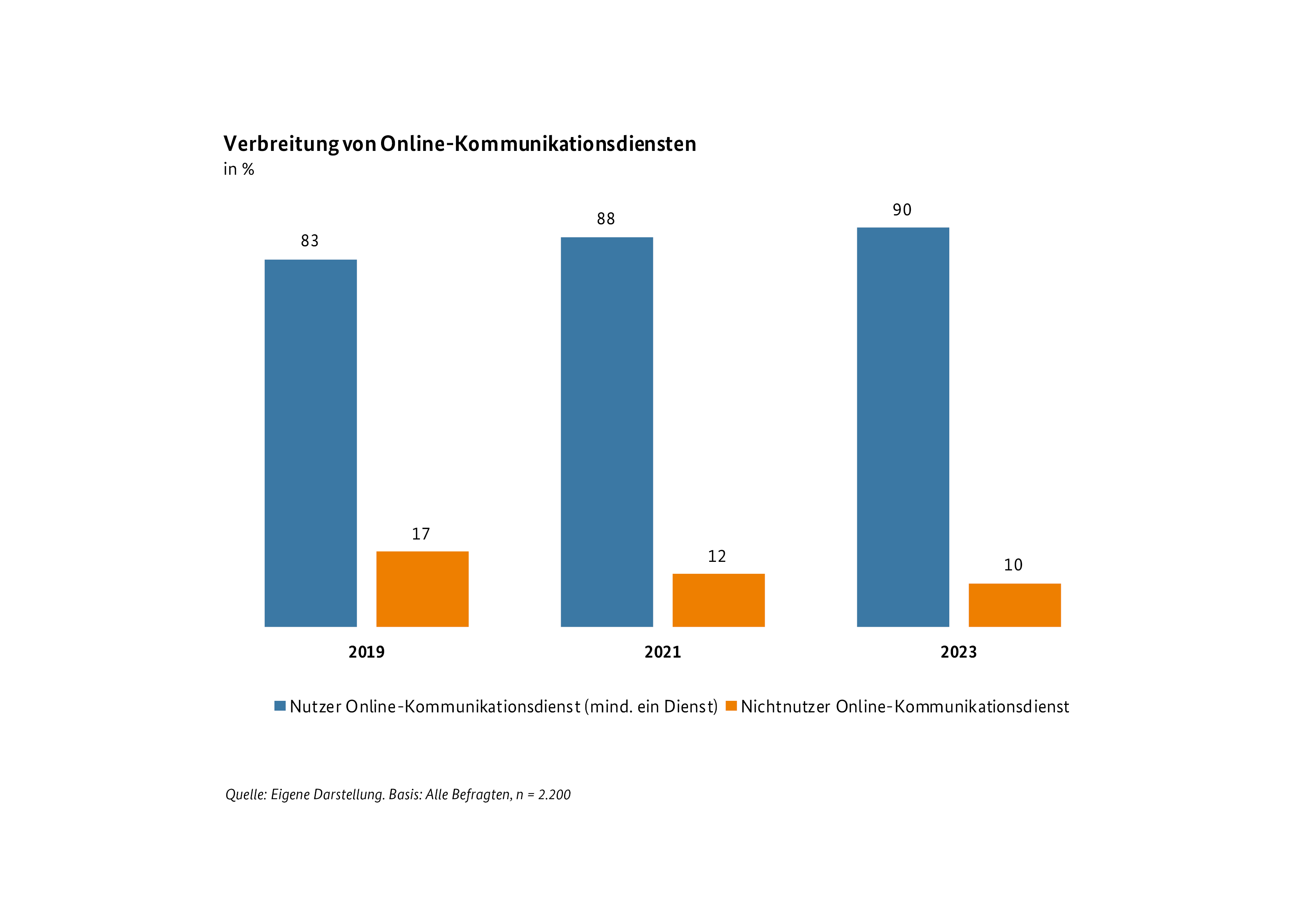 In Deutschland nutzen 90 Prozent der Wohnbevölkerung ab 16 Jahren regelmäßig Online-Kommunikationsdienste (mindestens einmal monatlich), hauptsächlich über Smartphones. Dies ist ein Anstieg von 7 Prozentpunkten im Vergleich zum Jahr 2019. Insgesamt hat sich die Verbreitung dieser Dienste auf einem vergleichbaren Niveau wie die Nutzung von klassischen Telekommunikationsdiensten etabliert.