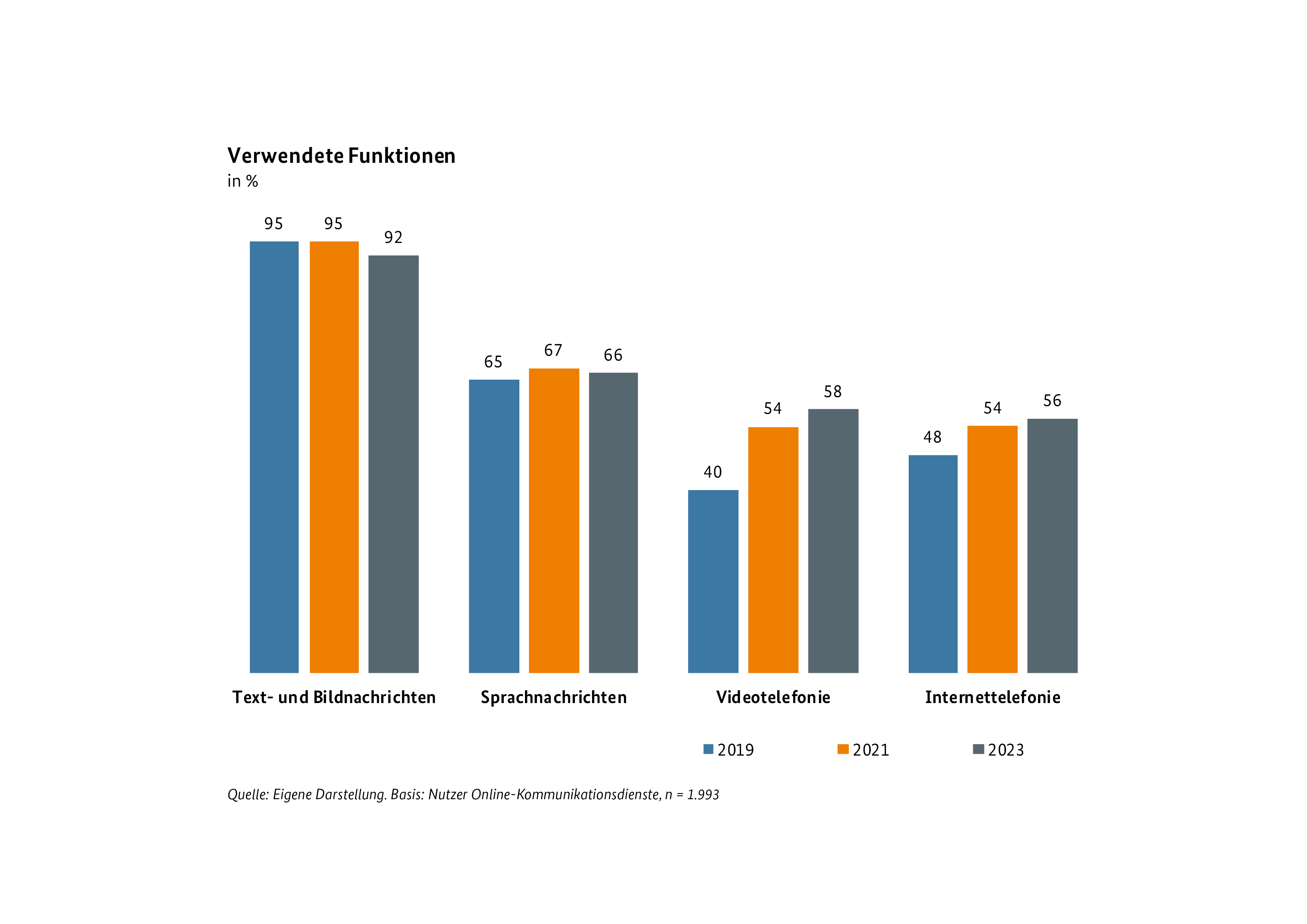 Die Nutzung der Funktionen Text- und Bildnachrichten sowie Sprachnachrichten ist aus Nutzersicht am stärksten verbreitet. Grundsätzlich werden Text- und Bildnachrichten von 92 Prozent der Nutzer versendet bzw. empfangen; Sprachnachrichten von 66 Prozent der Nutzer. Bei der Nutzung der Video- und Internettelefonie-Funktionen ist eine zunehmende Entwicklung erkennbar. Beide Funktionen werden inzwischen von deutlich mehr als der Hälfte der Nutzer von Online-Kommunikationsdiensten eingesetzt. Die Internettelefonie-Funktion erreicht einen Nutzungsanteil von insgesamt 58 Prozent, die Nutzung der Videotelefonie-Funktion ist auf einen Anteil von 56 Prozent angestiegen.