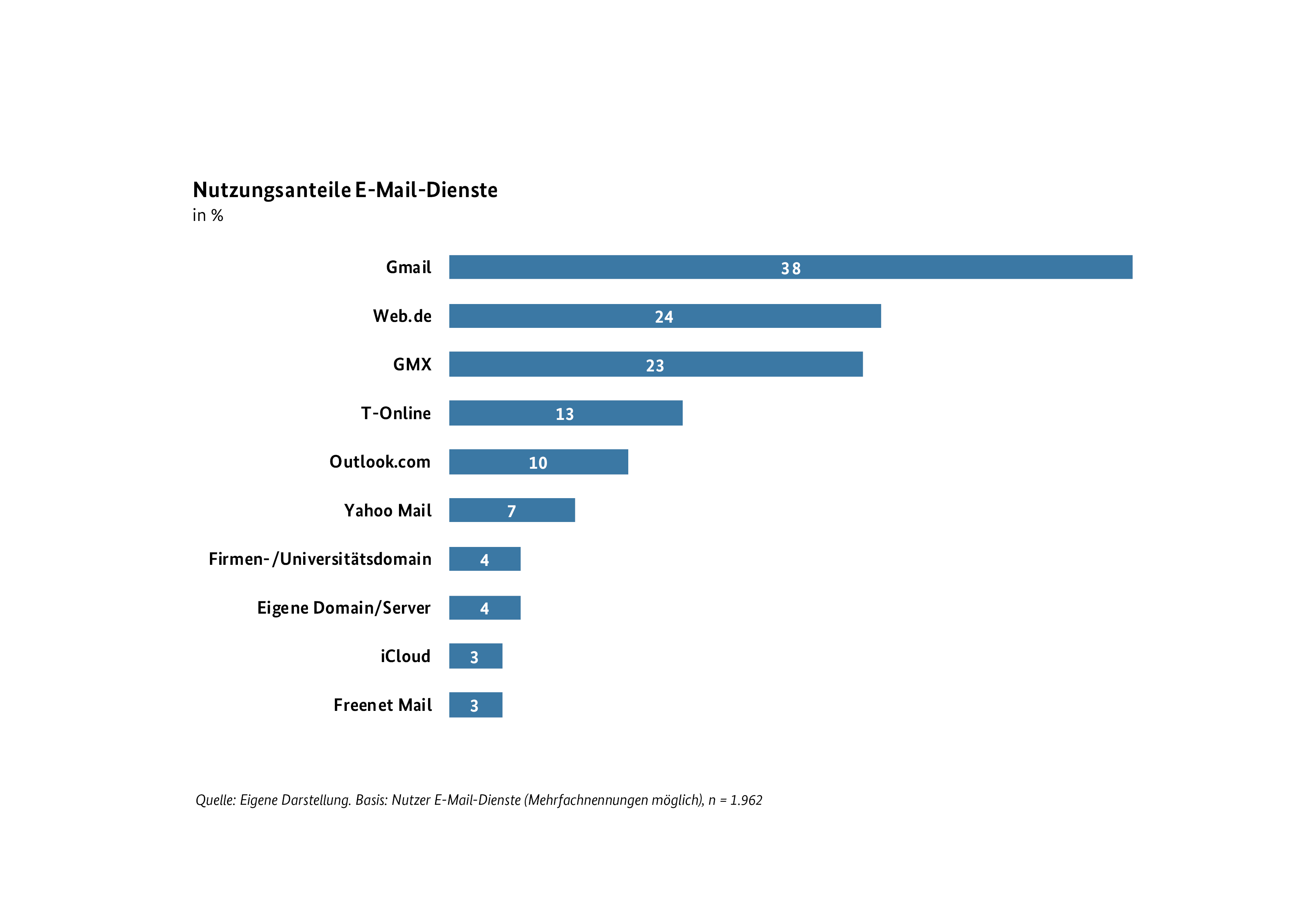 In Deutschland nutzen 88 Prozent (2021: 89 Prozent) der Bevölkerung ab 16 Jahren regelmäßig E-Mail-Dienste (mindestens einmal monatlich). Folgende E-Mail-Dienste werden von den Nutzern in Deutschland verwendet: 38 Prozent Gmail (2021: 36 Prozent), 24 Prozent Web.de (2021: 24 Prozent), 23 Prozent GMX (2021: 24 Prozent), 13 Prozent T-Online (2021: 13 Prozent) und 10 Prozent Outlook.com (2021: 9 Prozent).