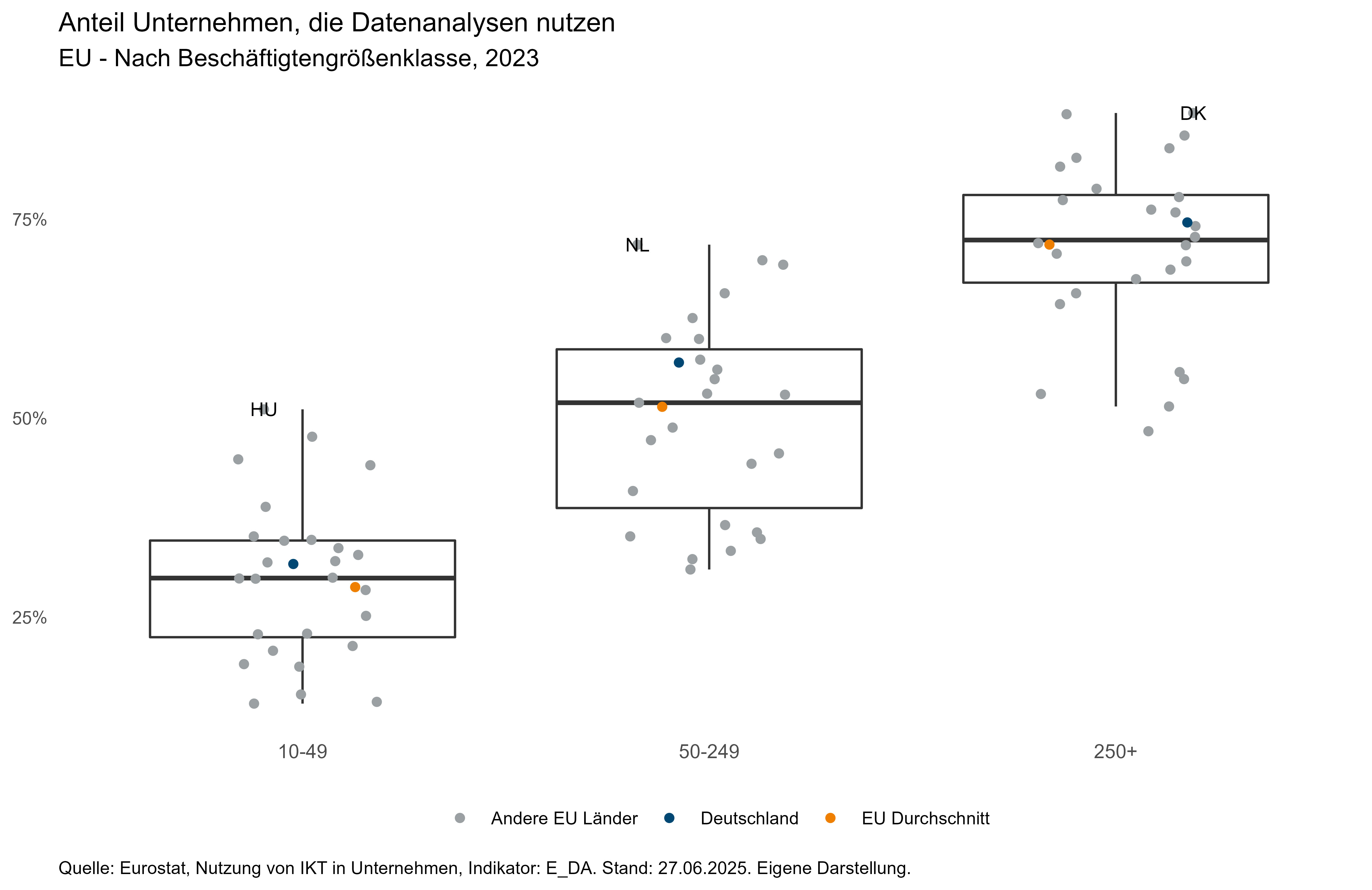 In der zweiten Abbildung ist erkennbar, dass der Anteil der Unternehmen mit Datenanalysen tendenziell mit der Unternehmensgröße steigt. Der jeweilige Anteil in Deutschland liegt über alle Größenklassen hinweg in der oberen Hälfte der Verteilung und oberhalb des EU-Durchschnitts.