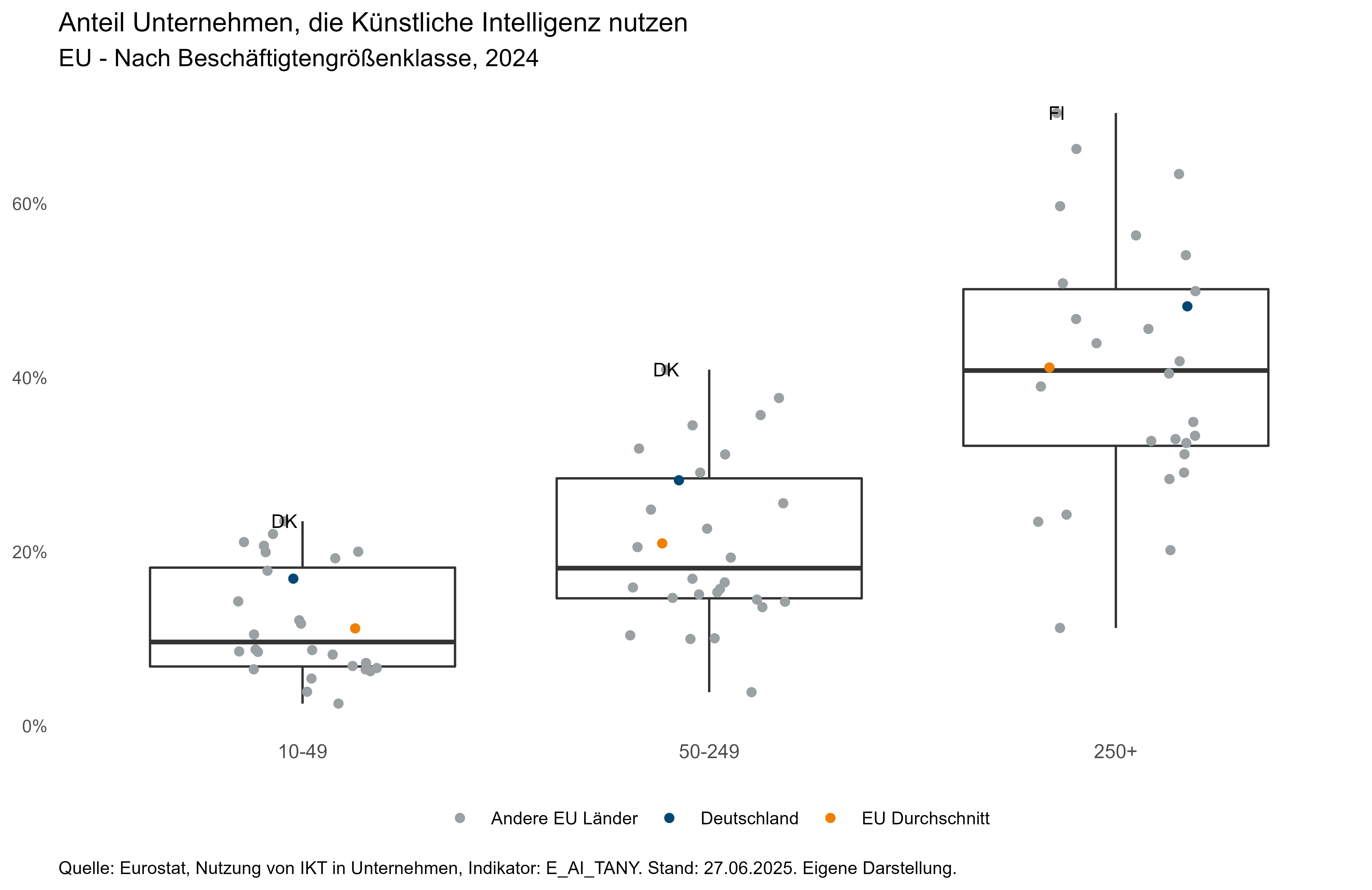 Aus der zweiten Abbildung wird ersichtlich, dass sowohl der Anteil der Unternehmen, die Künstliche Intelligenz verwenden, als auch die Streuung der Anteilswerte tendenziell mit der Unternehmensgröße steigt. Für kleine (10 bis 49 Beschäftigte) und mittlere Unternehmen (50 bis 249 Beschäftigte) liegt Deutschland mit 17 bzw. 28 Prozent oberhalb des jeweiligen Medians und EU-Durchschnitts. Für große Unternehmen liegt der Anteil in Deutschland mit 48 Prozent ebenfalls sowohl oberhalb des Medians als auch oberhalb des EU-Durchschnitts.